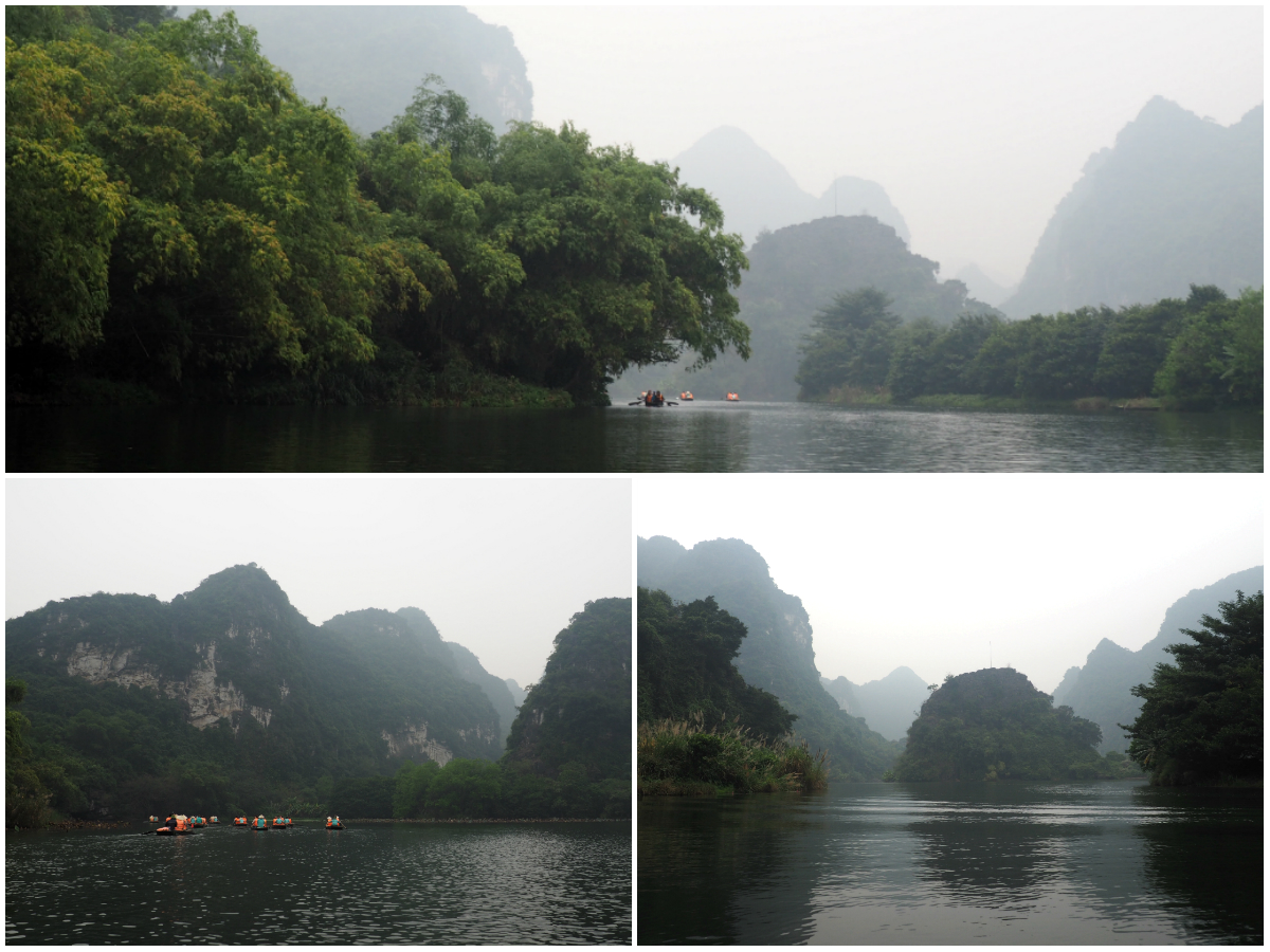 A continuación volvimos al coche y fuimos hacia Trang An. El día parecía que había mejorado un poco, la visibilidad continuaba siendo mala pero al menos no llovía. Trang An es un conjunto de acantilados calizos surcados por una serie de ríos, muy similares a los de Tam Coc. Al igual que éste, la forma de descubrir sus hermosos paisajes es a través de un paseo en barca (200.000 VND por persona, 8 €). A diferencia de Tam Coc, en Trang An hay tres recorridos diferentes para elegir; el propietario de nuestro hotel nos había recomendado el nº1, el mas completo ya que atraviesa mas cuevas y se visitan mas templos (en teoría, 9 cuevas y 3 templos). Las barcas tienen capacidad para 4 personas a parte del barquero, y a nosotros nos juntaron con una chica iraní que viajaba sola. A los remos iba una señora bastante anciana, que remaba con las piernas con parsimonia. A diferencia de Tam Coc, cerca de Trang An no hay ningún pueblo, así que nada más salir del embarcadero ya estábamos en plena naturaleza. Lentamente la barca fue atravesando los espectaculares acantilados, llenos de bosques y envueltos en una neblina que le daba un toque misterioso. Aunque el paisaje era similar que el del día anterior, no dejaba de sorprendernos. Teníamos la sensación que el relieve de Trang An no era tan acentuado, y que las barcas no pasaban tan cerca de los acantilados. Aun así los paisajes son realmente fascinantes, y cada vez que dejabas un acantilado atrás nunca sabías qué te ibas a encontrar.